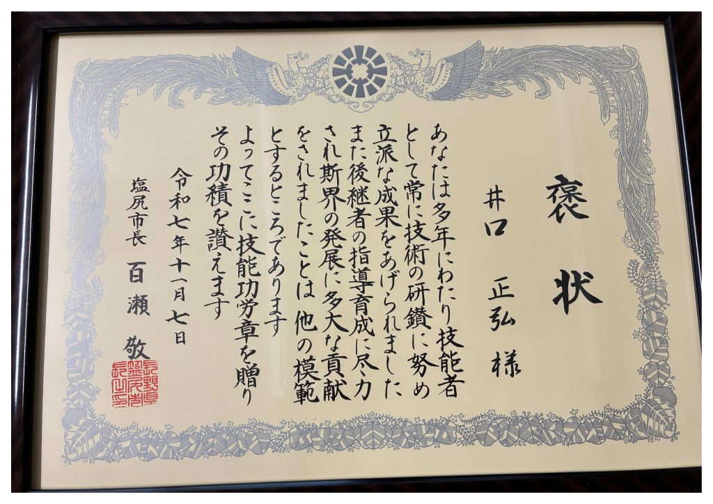 このたび、当社の社長が永年にわたる技能向上への取り組みと業界への貢献が評価され、技能褒賞を受賞いたしました。